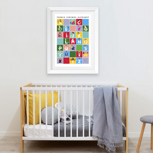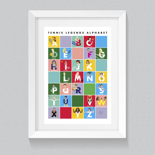 This bold and colorful alphabet poster showcases some of the greatest tennis legends in history.